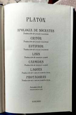 Como se menciona en el primer mensaje del hilo, desde agosto Gredos reedita en coleccionable de quiosco la Biblioteca Clásica Gredos, supongo que una selección de volúmenes. Hoy compré uno para "catarla". Tapa dura con apariencia lujosa, papel agradable al tacto y tamaño de letra generoso para los que acumulamos dioptrías, presbicia, etc. Las ediciones críticas de Gredos, con su aparato de notas a pie de página en un formato más económico. Tengo entera la que salió en quioscos en 2000 y que rellené con volúmenes posteriores de la de 2006 (los dos tomos de Leyes platónico, por ejemplo). En este número de la nueva colección se incluyen siete diálogos platónicos, poniendo como (hasta cierto punto engañoso) título uno de ellos. Por 15€ probablemente no encontrarás mejores traducciones (sin desmerecer las excelentes en Alianza Editorial) en un solo tomo, aunque ya lo tengas repetido. _________________ Web personal