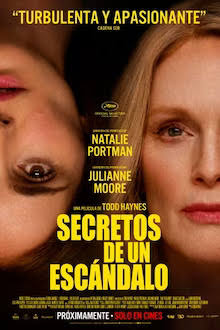 Ayer tarde, Secretos de un escándalo; el título original es May December, en relación con la diferencia de edad de la pareja protagonista: un matrimonio que, tras superar el escándalo, más de veinte años atrás, de que ella, Gracie (con 36 años) [Julianne Moore]. se liara con él, Joe (entonces de 12 o 13) [Charles Melton], recibe la visita de una actriz, Elizabeth (Natalie Portman), que interpretará a Gracie en un filme que se prepara sobre su caso. La relación entre lso tres, con Elizabeth queriendo conocer a la pareja para preparar mejor su papel, irá destapando detalles sobre una situación que no parece haberse calmado en la familia y el vecindario.