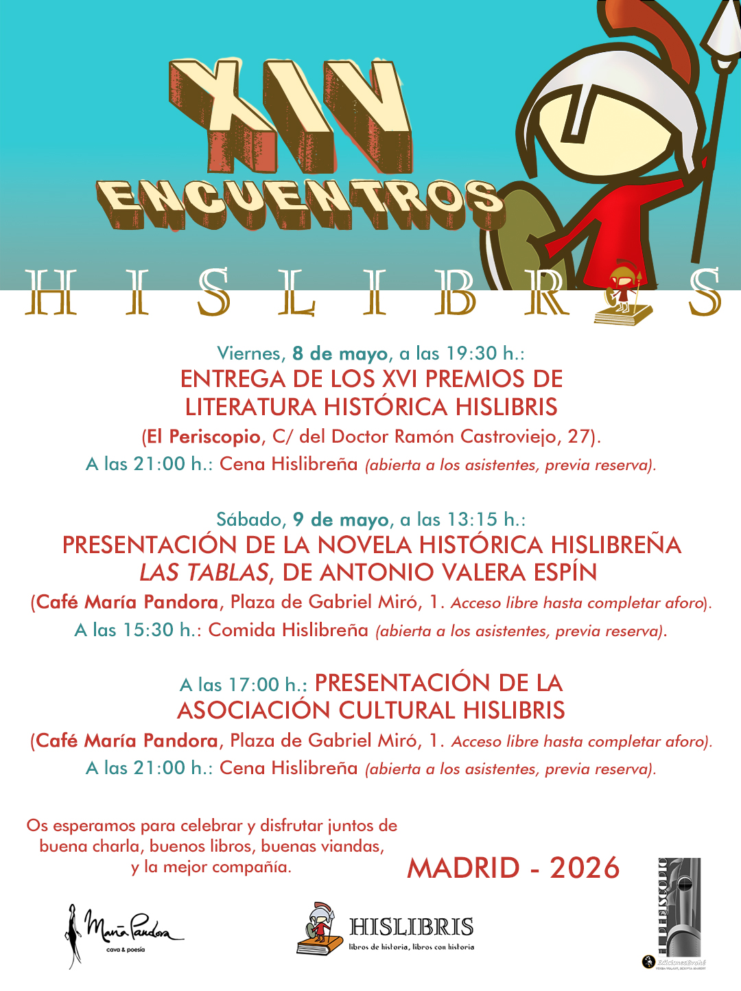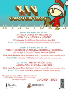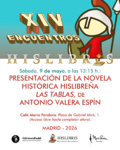 Un año más —y ya van unos cuantos— vuelven los Encuentros Hislibris, nuestra cita anual con la Historia, la novela histórica y, sobre todo, con la buena compañía. Los próximos 8 y 9 de mayo, en Madrid, celebraremos la entrega de los XVI Premios de Literatura Histórica Hislibris, presentaremos la novela Las Tablas, de nuestro compañero Antonio Valera Espín, y os contaremos, entre charla y charla, qué andamos tramando con la recién creada Asociación Hislibris.